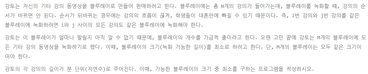 - M개에 블루레이를 모든 기타 강의 동영상을 녹화하기로 했다. 그리고 블루레이는 모두 같은 크기여야한다.