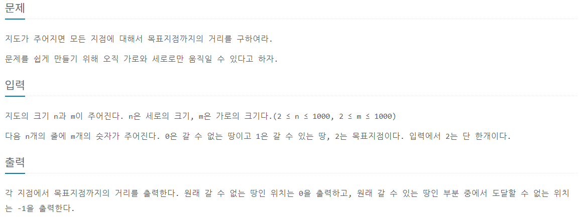 목표지점(주어진 문자상 2인지점) 부터 이동 가능한 거리라면 거리 아닐경우 -1 로 표시한다. 원래 이동하지못하는경우라면 0을 표시하여 출력한다.